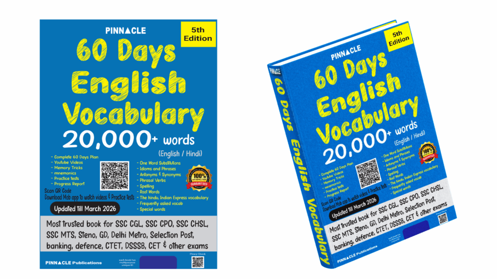 If you are looking for the best English vocabulary book for competitive exams 2026, the Pinnacle 60 Days English Vocabulary 20,000+ Words – 5th Edition is a complete and structured solution. Updated till March 2026, this bilingual vocabulary book is designed for aspirants preparing for SSC, Banking, UPSC, Defence, Railways, State PCS, Teaching exams, and all government & competitive exams.